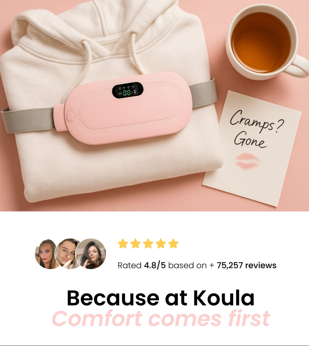 The belt combines targeted warmth and gentle soothing vibrations over the lower abdomen or lower back. Warmth helps relax muscles while vibrations provide calming comfort. Many users feel relief within minutes. (Koula is a wellness device, not a medical treatment.)